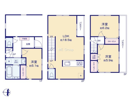| 築年月 | 2025年10月築 | 間取り | 3LDK (洋室5.1/LDK18.5/洋室6.2/洋室5.9) | ||